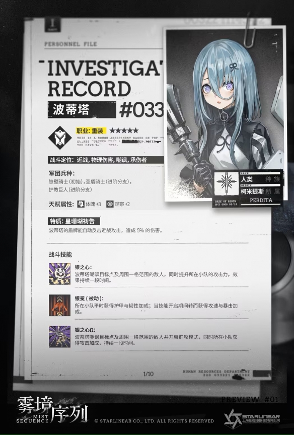 特派调查员波蒂塔,原隶属于柯米提斯坚盾骑士团。 该调查员接受过专业战斗训练,拥有优秀的身体素质,可使用少量奇迹辅助战斗,现分配其至作战部工作。