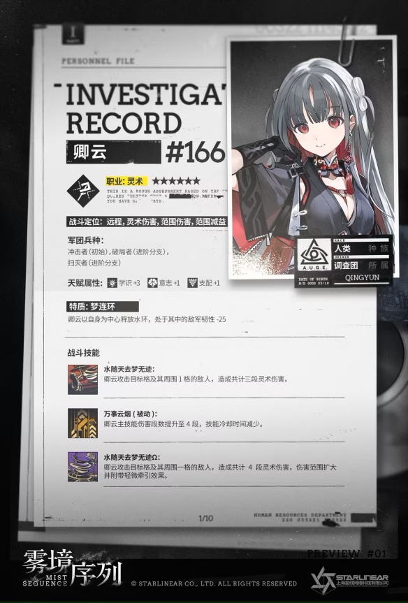 调查员卿云,原隶属于殷夏科研机构,经由民间招募加入调查团。 该调查员精通殷夏秘术与印术,现分配至调查团技术部工作。