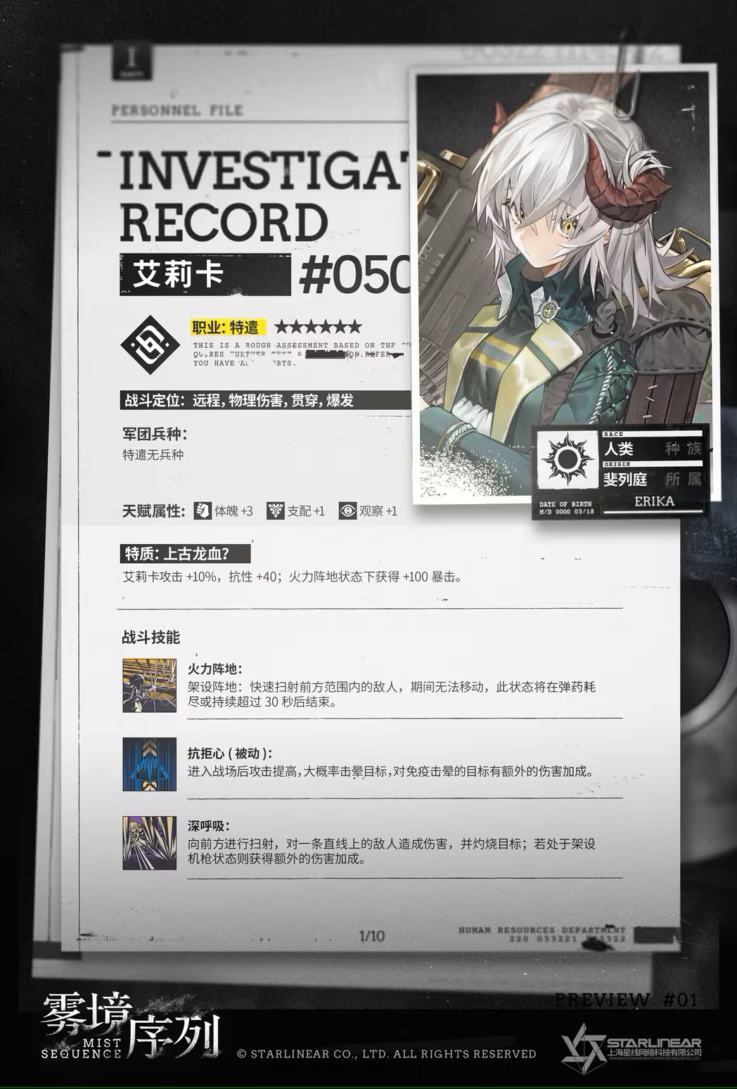 特派调查员艾莉卡,原隶属于帝国第一国防军第七师92团。 该调查员拥有优秀的身体素质,现分配其至作战部工作。