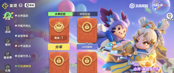 3、然后就能够在这里进行红包的领取,分享并领取6次,即可进行小乔琳琅生皮肤的获取。