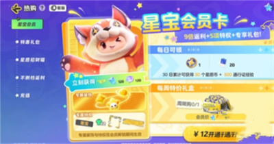 会员卡相当于月卡,12块钱30天,可以获得30个星愿币和600点通行证。
