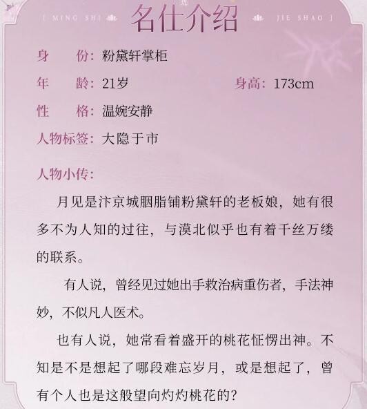 本期浮生忆玲珑名仕录,灵儿化身一线记者,为大家带来了大胤名仕「月见」的个人档案。