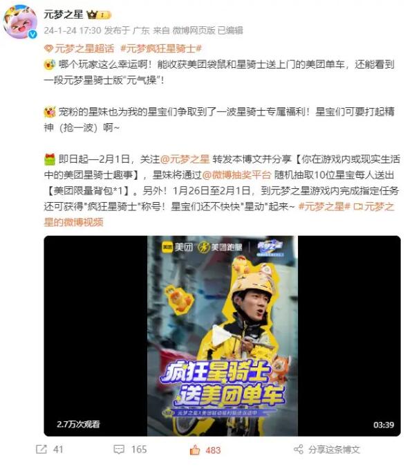 今日起—2月1日,星宝们只要关注元梦之星官方微博,并转发分享【你在游戏内或现实生活中的美团星骑士趣事】,星妹将随机抽取10位星宝每人送出【美团限量背包*1】。