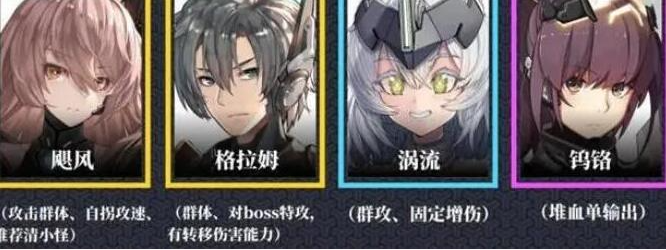 飓风(群攻)、格拉姆(群攻 伤害转移)、涡流(群攻增伤)、钨铬(单体输出)等角色。