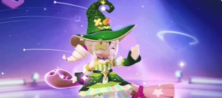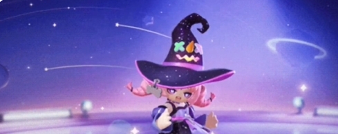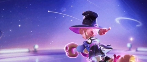 1、入场动画:糖果女巫骑着魔法扫帚入场,站定后会对着角色挥手。