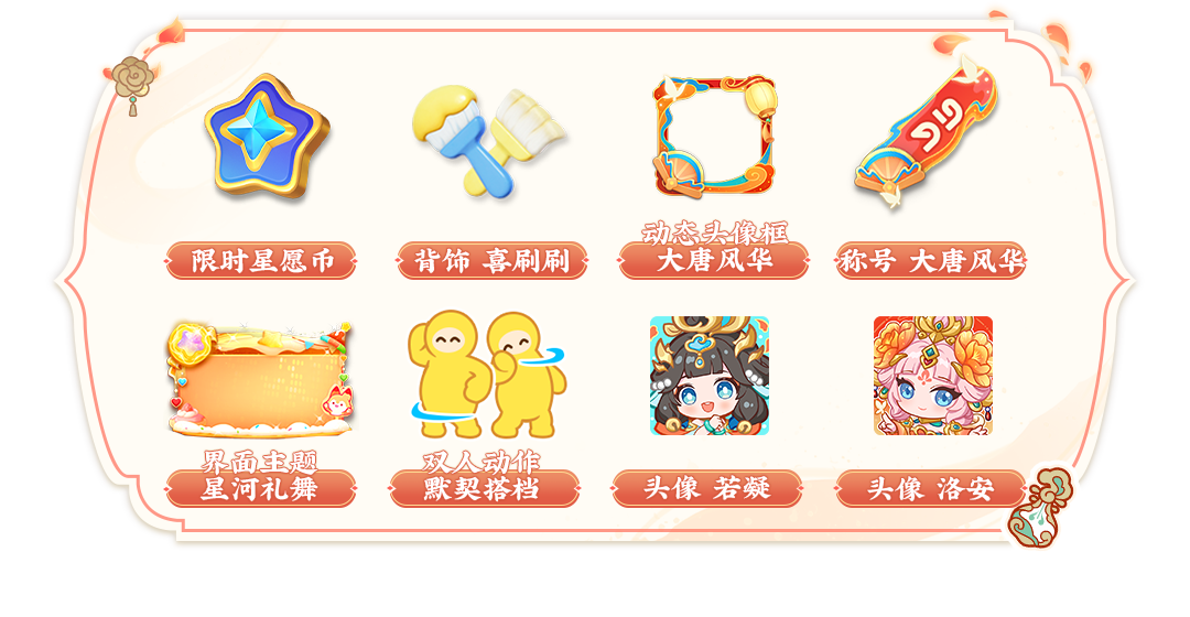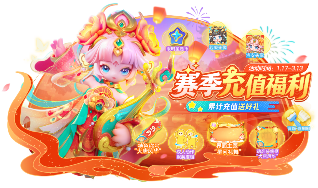 1月17日-3月13日,在大唐风华赛季期间充值金额到达特定档位,即可领取限时星愿币、背饰 喜刷刷、动态头像框 大唐风华、称号 大唐风华、界面主题 星河礼舞、双人动作 默契搭档、头像 若凝、洛安等奖励