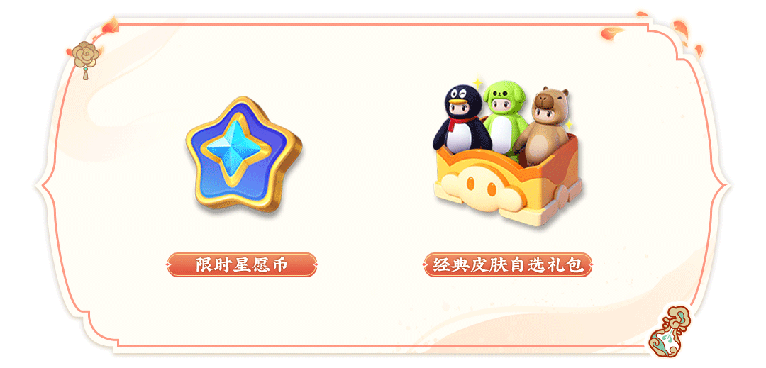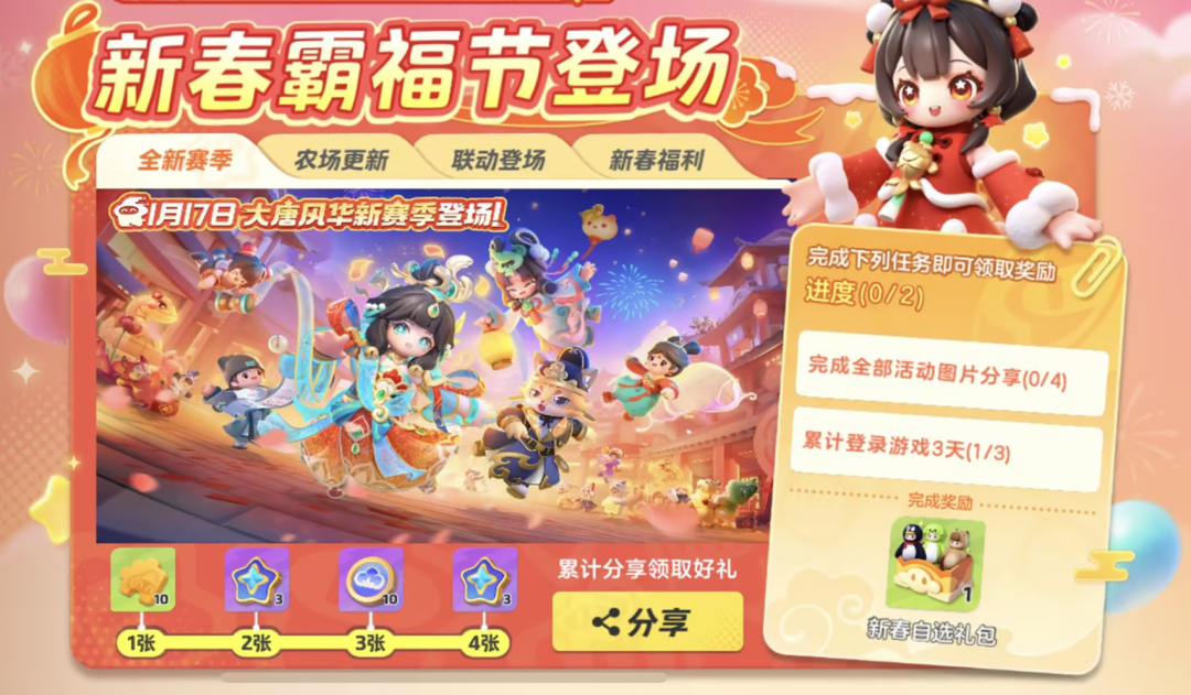 1月24日,新春霸福节即将登场!预热活动即将开启,1月17日-1月23日星宝参与活动并分享,共可获得限时星愿币*6、福利碎片*10等奖励,完成全部活动图片分享,还能获得自选礼包时装 卡皮巴拉、气泡狗阿绿、幸运鹅、通用排位保护券*3四选一!