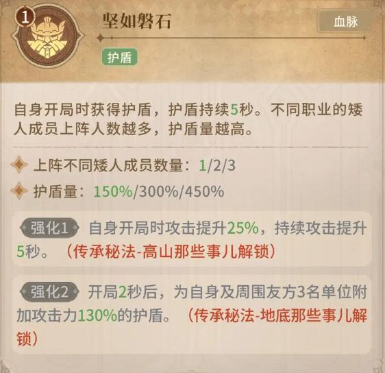 坚如磐石:自身开局时就可以获得护盾,不同的职业的矮人越多,获得的护盾量也就越高。