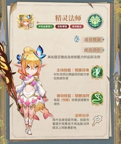 精灵法师的主动技能【银藤召唤】会瞄准生命值比例最低的敌人造成攻击力一定比例的伤害,在(成员达到41级、121级)强化之后,此技能每次参与击杀敌人,技能倍率都会提升(可叠加);同时针对低血量的单位,技能伤害会进一步提升。