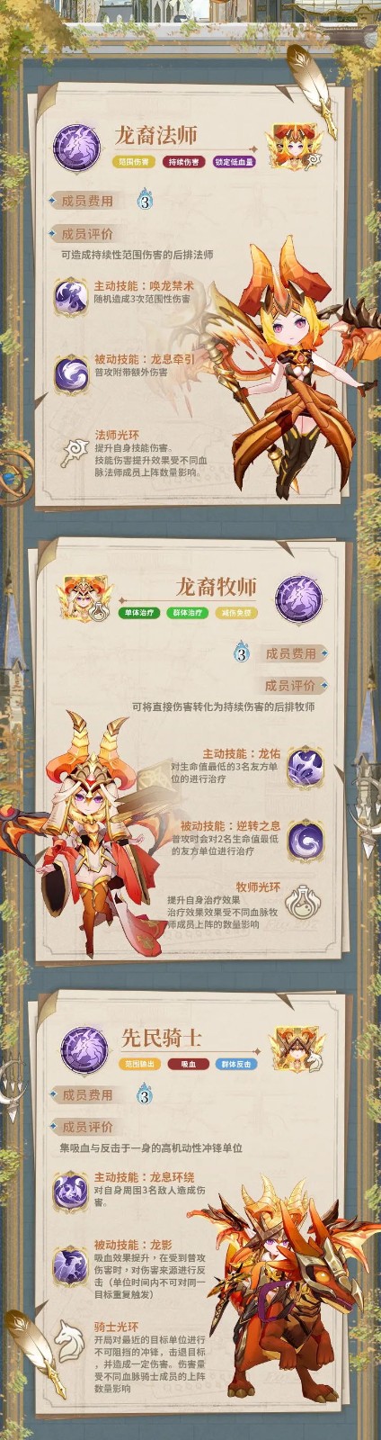 今天给大家带来了《不朽家族》龙裔血脉资料分享,龙裔血脉成员包含龙裔法师、龙裔牧师、龙裔骑士。血脉天赋效果:普攻附带[灼烧]效果,[灼烧]每秒对目标造成一定伤害,[灼烧]的伤害量效果受不同职业的龙裔成员的上阵数量影响。