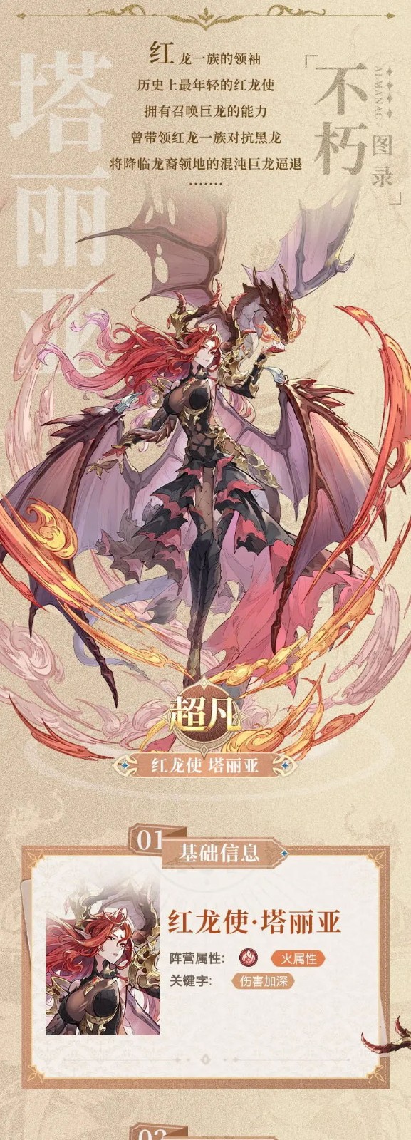 今天给大家带来了《不朽家族》塔丽亚角色图鉴分享,塔丽亚是红龙一族的领袖,历史上最年轻的红龙使,拥有召唤巨龙的能力,曾带领红龙一族对抗黑龙,将降临龙裔领地的混沌巨龙逼退,游戏中可以为我方成员施加天火掌握,想要了解不朽家族塔丽亚详情的朋友可以看看下方介绍!