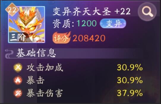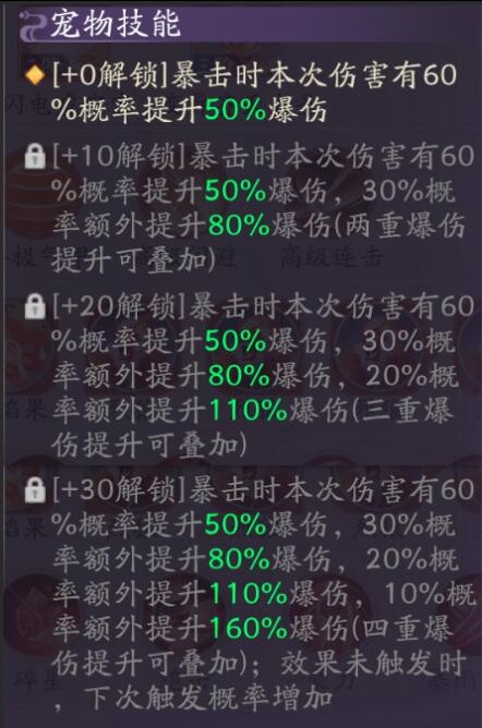 宠物齐天大圣能提升妖灵的百分比攻击、暴击、爆伤属性。宠物技能能在妖灵暴击时提升本次暴击的伤害,+30后有4层独立的爆伤增加几率,按期望能提升92%的爆伤,效果每次未触发时,还会增加下次触发几率。