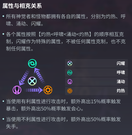 2.角色属性:游戏内一共有4个属性,每个角色都会归于某一属性。它们相互之间克制关系如下图。可以看出,闪耀属性(就是那个五彩斑斓的黑)相对比较独立,不会克制也不会被克。