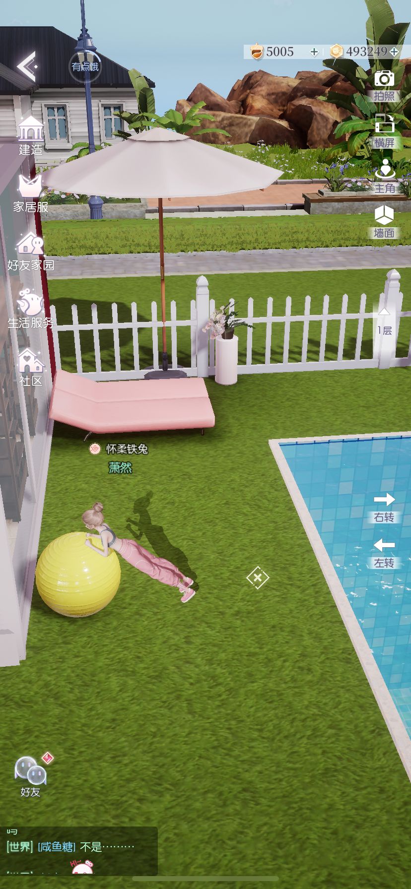 点击游泳池还能开启游泳模式,点击健身球女儿就会开始健身,阳台的躺椅,也能给女儿休息
