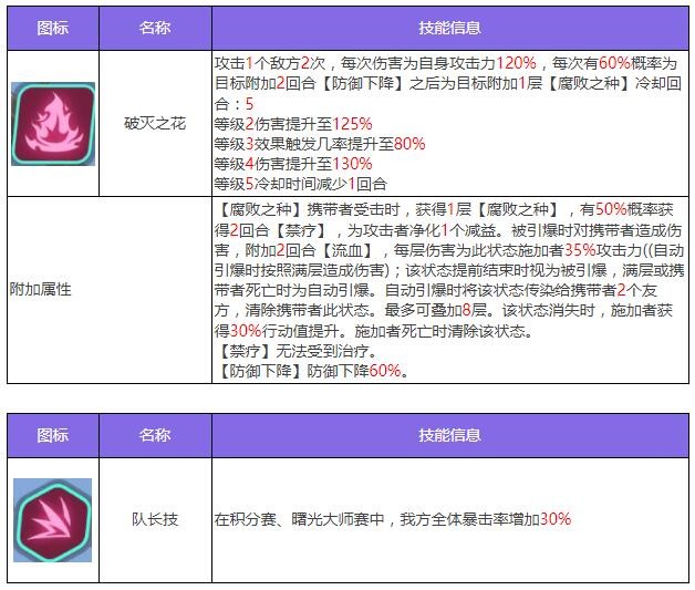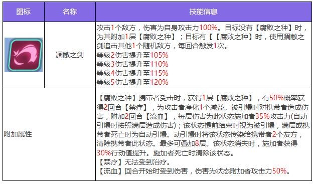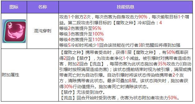 恩布拉是一名可以通过给敌方附加【腐败之种】并通过引爆【腐败之种】来造成伤害的强力输出攻击型代行者。凋敝之剑能攻击敌方并为没有【腐败之种】的目标施加【腐败之种】状态,否则能够再次使用该技能追击其他敌方目标。混沌穿刺则攻击敌方目标2次,每次偷取目标1个增益效果,并在第二段伤害引爆目标身上的【腐败之种】,同时在觉醒后能够将【腐败之种】传染给其他敌方目标。破灭之花会攻击敌方单体目标2次,为其附加【防御下降】,技能结束后再为目标附加【腐败之种】