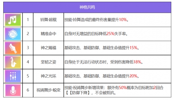 回旋曼舞能为敌方附加【禁疗】和【烙印】,觉醒后在攻击敌方全体目标的同时附加【攻击下降】,还会为我方全体附加【神乐之舞】,提升我方的伤害以及我方受到治疗的效果。