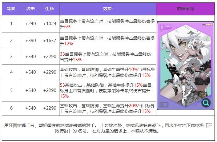 林啸是一名可以为自己增加大量暴击的攻击型代行者。虎焰流光可以为林啸附加若干层虎啸状态,并对敌方全体造成伤害。林啸使用爆裂冲击时,若造成暴击,将为敌方目标附加额外的流血状态。