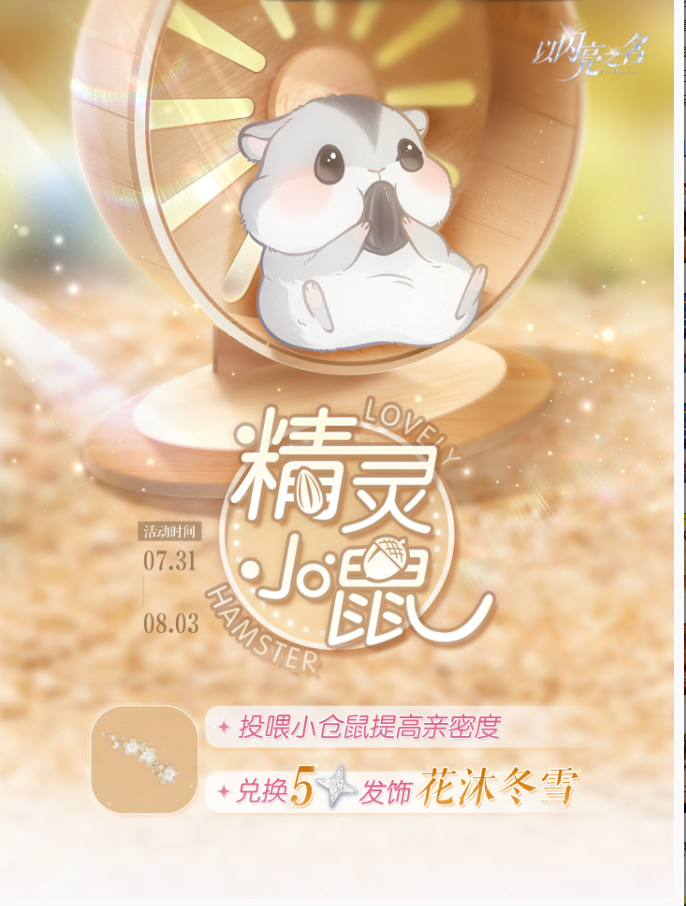 欢迎投喂精灵小鼠,投喂小仓鼠有机会获得金币、基础色卡、遇之钥等奖励,累积亲密度还可领取五星饰品【花沐冬雪】、拍照萌拍【冬果寻鹿】、钻石*30、潮流色卡*9和多种材料道具!