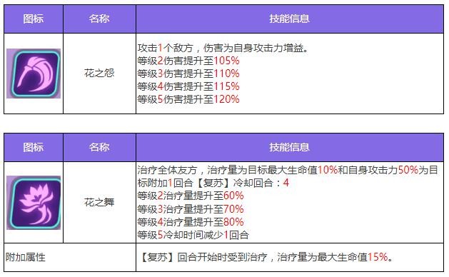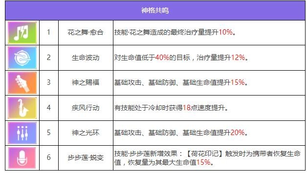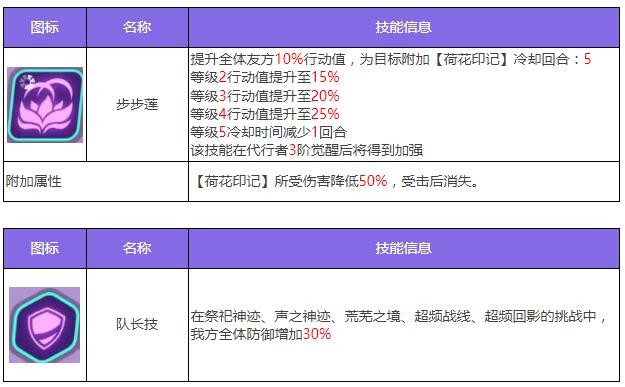 安瑟尼斯是一个可以同时提供行动值增益和生命回复的辅助型代行者。步步莲释放时,可以为己方全体提供行动值,并施加【荷花印记】,【荷花印记】可以减少效果持有者所受的伤害。己方每个【荷花印记】的触发,都会为安瑟尼斯提升一定的行方每个【荷花印记】的触发,都会为安瑟尼斯提升一定的行动值。花之舞则具有强大的全队治疗能力,在治疗的同时可以为每个队友施加【复苏】效果。
