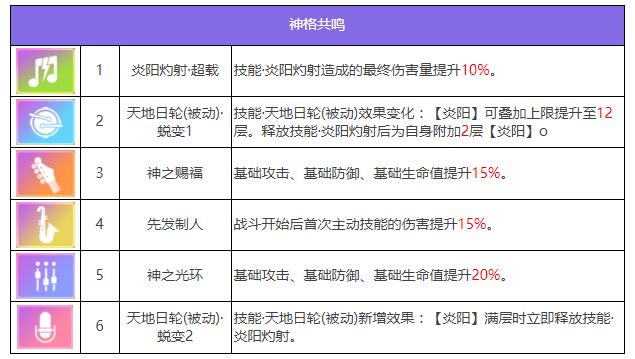 天地日轮仑(被动)回合开始时获得1层【炎阳】;获得增益时获得1层层【炎阳】。最多叠加8层。该技能无法升级该技能在代行者3阶觉醒后将得到加强