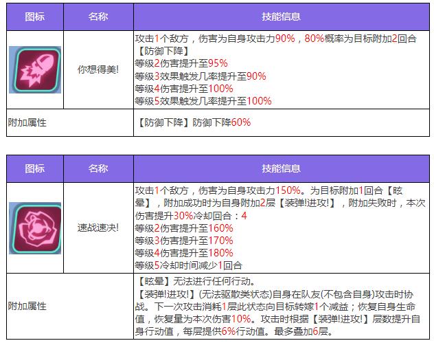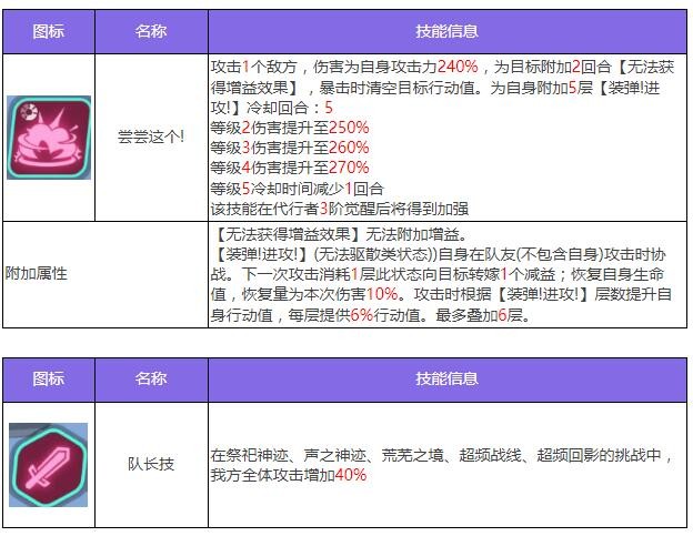 布拉斯特是具有协战能力和强大续航能力的单体攻击型输出代行者。你想得美!对单体目标造成伤害时有概率附加【防御下降】效果。速战速决则会为目标附加【眩晕】,附加成功时会为自身附加若干层【装弹!进攻!】状态,附加失败时则会造攻】状态,然后攻击单体目标,为目标附加【无法获得增益效果】,暴击时还未清空目标全部行动值。【装弹!进攻!】可使其在攻击时向目标转嫁减益,恢复自身生命值,并且在队友攻击时协战同时提升自己的行动值。在觉醒后,该技能还会为全体友方附加【暴击提升】状态。