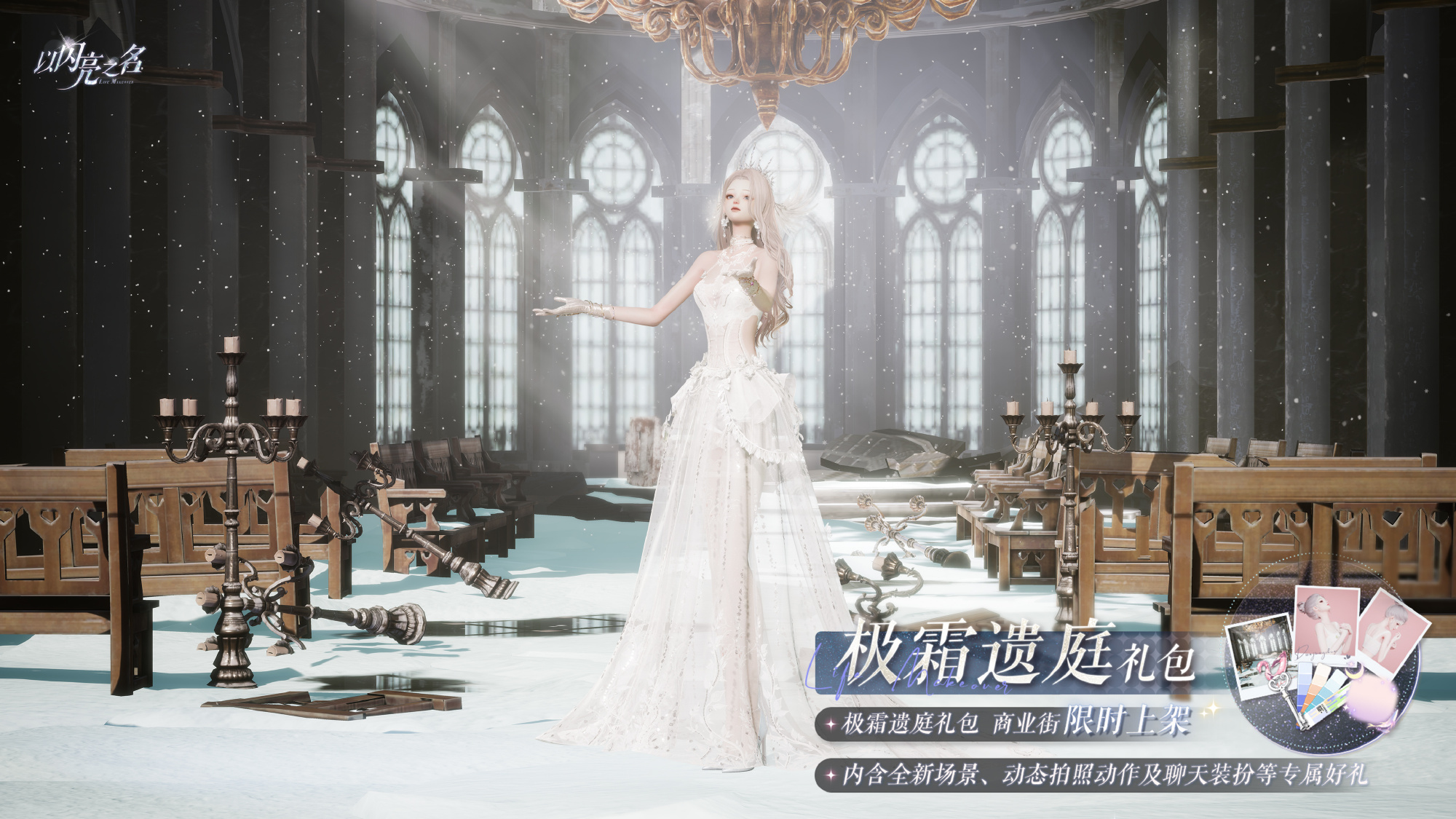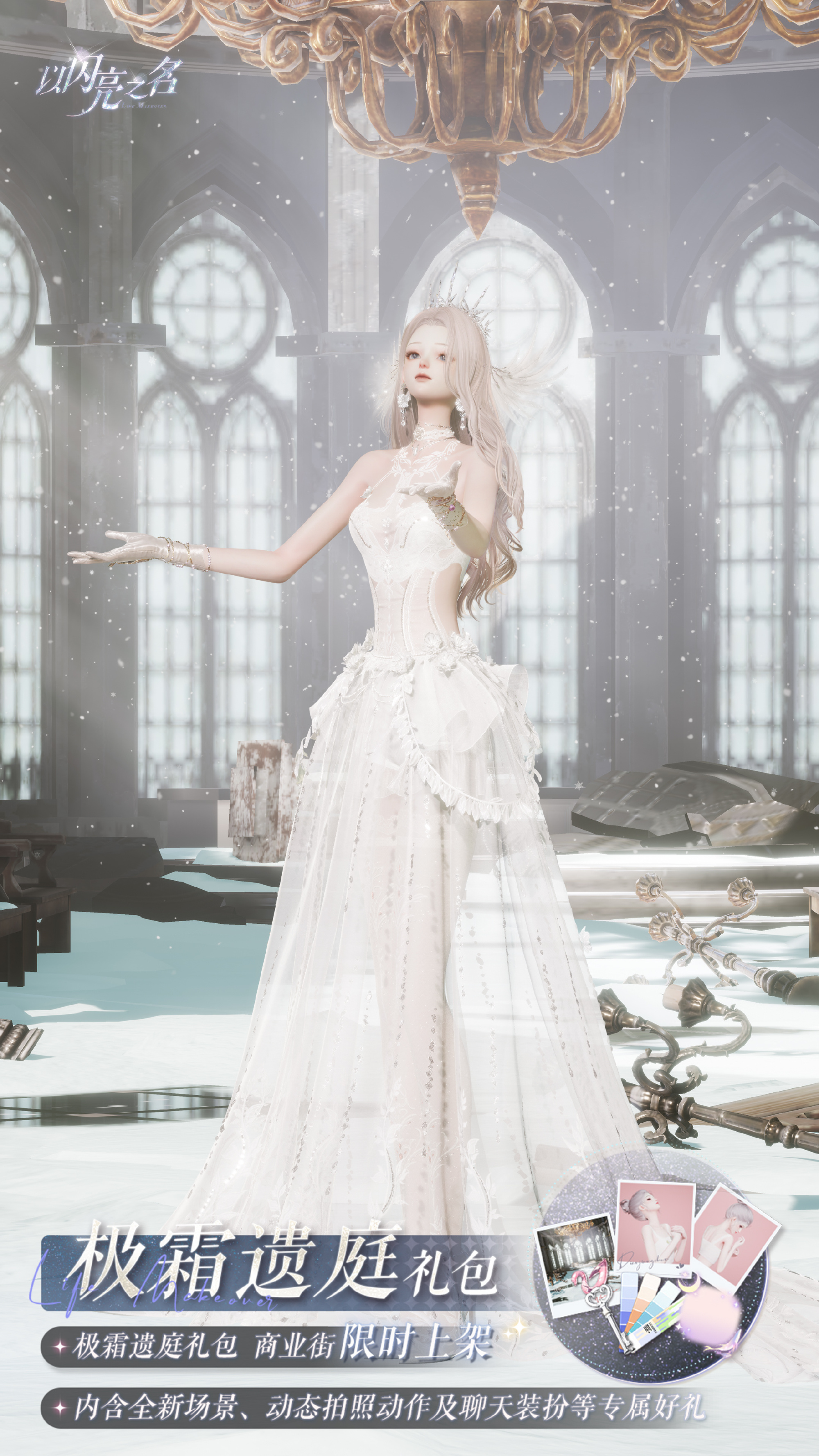 礼包内含摄像机镜头动态动作【初雪祈愿】、拍照场景【落霜祈廷】、拍照动作【霜风轻呓】、聊天气泡【幻月游鲸】、潮流色卡*26和遇之钥*40。