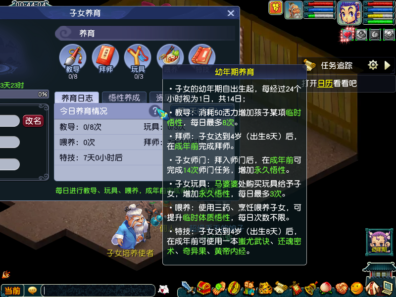 孩子出生后,子女养育界面会更新,出现【养育日志】、【悟性养成】和【资质预览】三个小界面和养育细分项。