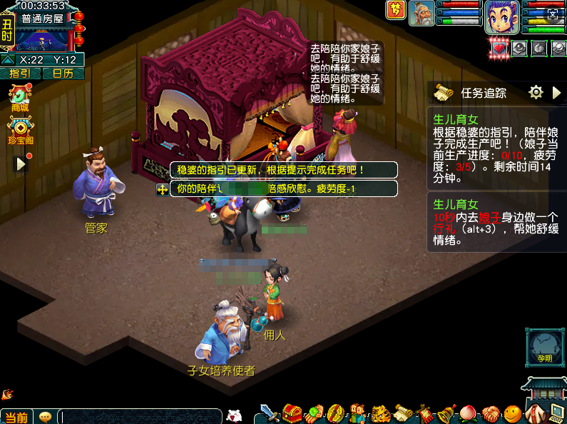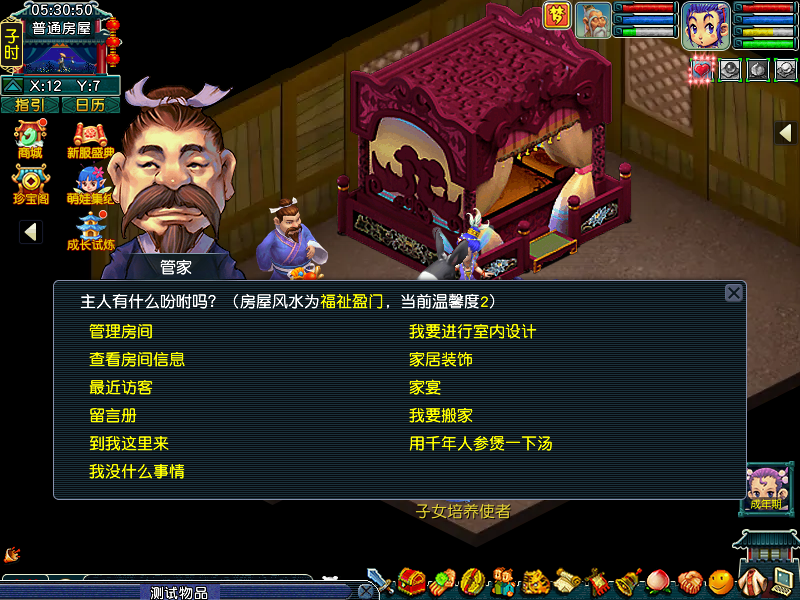少侠的等级若是≥65级,有自己的房子便可以通过【千年人参】生育孩子。方法是双方组队找到房子的管家,选择【用千年人参煲一下汤】即可开始任务。