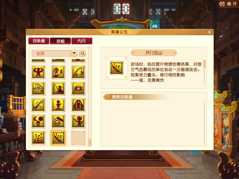 全新技能这次子女系统放出后最大的亮点是放出了全新技能,有各门派的技能,也有修行技能。大家即使不在测试区,也可以在游戏中点击右上角的【指引】-【唤兽众生】-【技能】,拉到最下面查看。