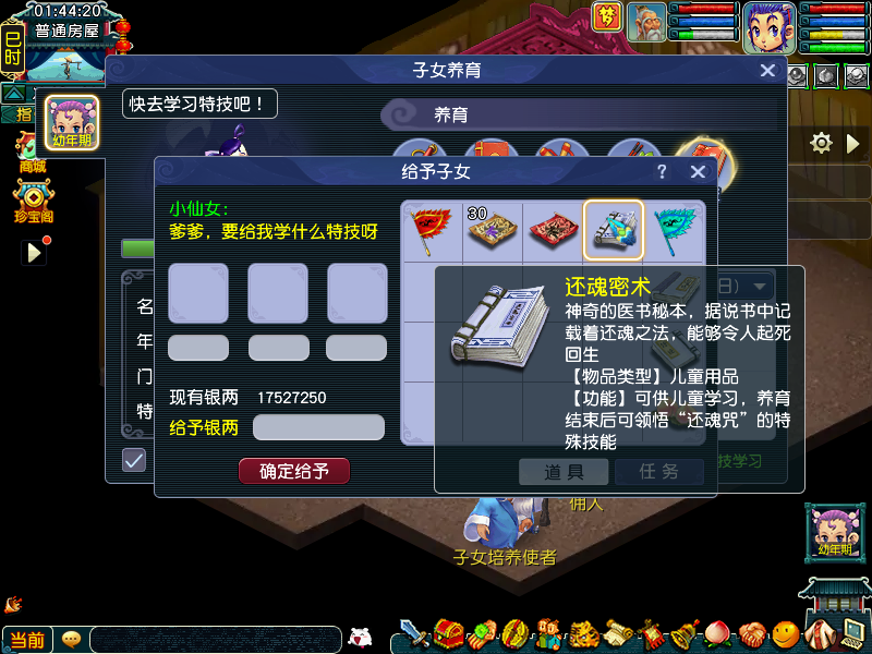 孩子第8天后可以学习特技,可以选择【蚩尤武诀】、【还魂秘术】、【奇异果】和【黄帝内经】中的一种。