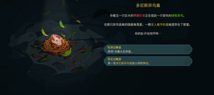 将一张多尼斯异鸟蛋假如你的牌组。(于篝火处孵化可得一张0费14伤的攻击牌。)