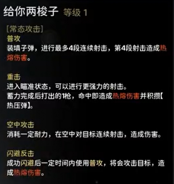 普攻:装填子弹,进行最多4段连续射击,第4段射击造成热熔伤害。