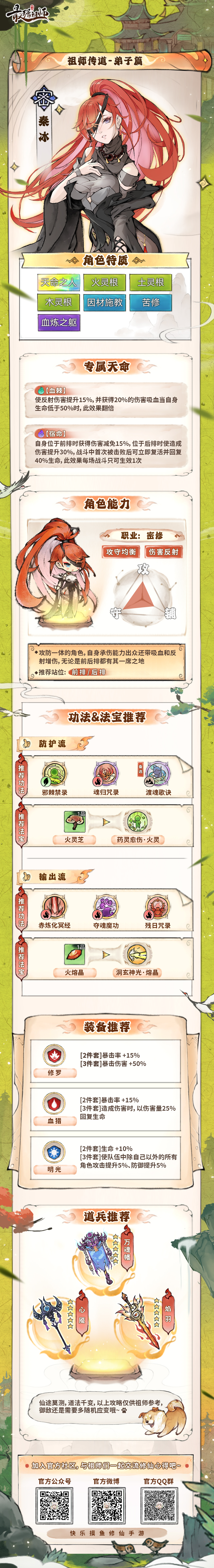 《最强祖师》是一款能随机生成各种有趣弟子,并组建弟子团生产、战斗的修仙模拟经营手游。游戏中秦冰是性价比最高氪金前排;顶级战斗弟子,前中后期全方位制霸,PVE和PVP强度都极高,又肉又输出并且多灵根契合当前五行塔版本。今天给大家带来了《最强祖师》秦冰养成攻略,一起来看看吧!