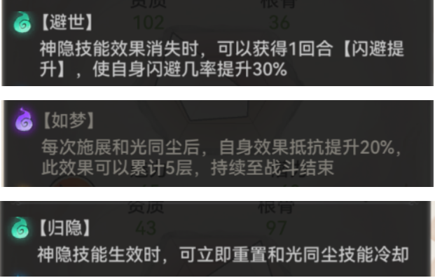 针对天土隐的天命配置,推荐选用避世、如梦和归隐,这三个天命能够有效缩短技能释放时间,并在技能释放后提高闪避率和效果抵抗,极大提升了天土隐在实战中的生存与辅助能力。