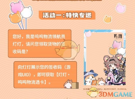 在活动玩法中向灯灯展示签收码【游戏UID】,即可领取灯灯呜呜物流透卡*1