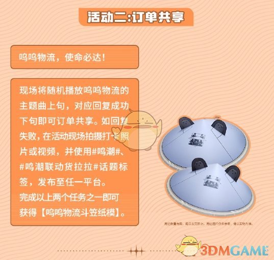 完成以上任意任务之一,即可获得奖励呜呜物流斗笠纸模;