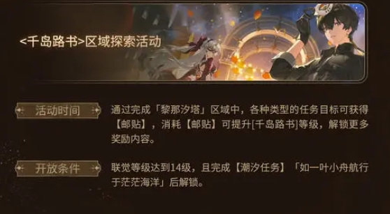活动时间 通过完成「黎那汐塔」区域中,各种类型的任务目标可获得【邮贴】,消耗【邮贴】可提升[千岛路书]等级,解锁更多奖励内容。