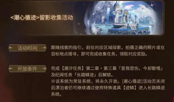 ※该系统为常驻系统,将永久开放。[潮心循迹]活动页关闭后漂泊者仍可继续通过使用特殊道具【迹鳞】进入长路鳞迹系统。