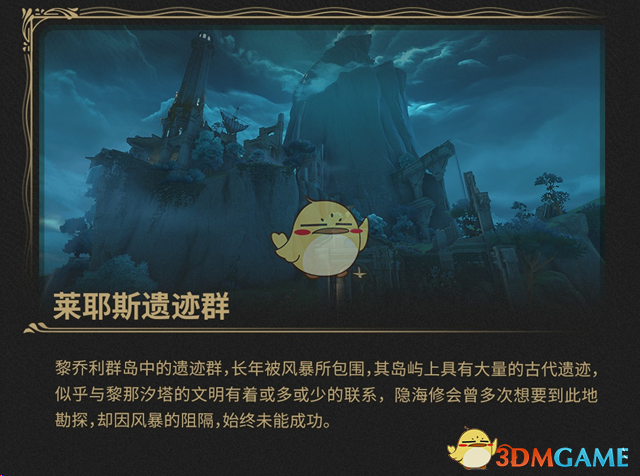 4.莱耶斯遗迹群:充满古代遗迹的小岛,长期被风暴环绕,似乎隐藏着与黎那汐塔文明相关的秘密,隐海修会多次试图勘探均未成功。