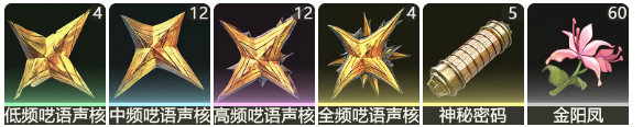 1、突破材料:低频呓语声核*4、中频呓语声核*12、高频呓语声核*12、全频呓语声核*4、神秘密码*5、金阳凤*60.