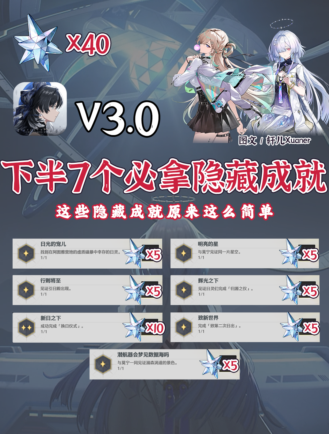 鸣潮V3.0下半隐藏成就有哪些,隐藏成就是指未在成就列表中列出的成就,只有在你完成该成就后才会显示出来m,玩家轩儿Xuaner给各位整理了鸣潮3.0下半版本7个隐藏成就,都是做任务就可以拿到,非常简单。