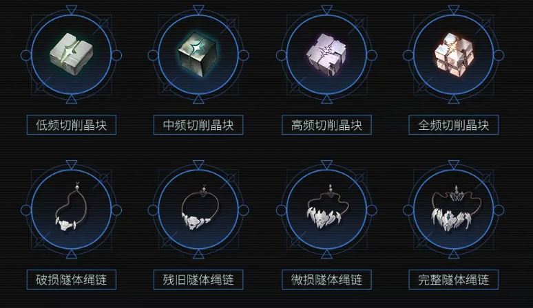 武器突破所需材料包括破损隧体绳链、低频切削晶块、中频切削晶块、微损隧体绳链以及完整隧体绳链,各阶段具体数量配置可参考下方图示说明。