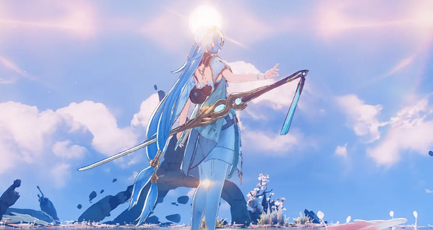 该武器采用蓝白主色调,整体设计融合精密仪器与宇宙观测意象,呼应“万端造物,析解万象”的核心理念。其造型语言强调理性、秩序与可推演性,象征在复杂战斗环境中建立稳定支援节奏的能力。
