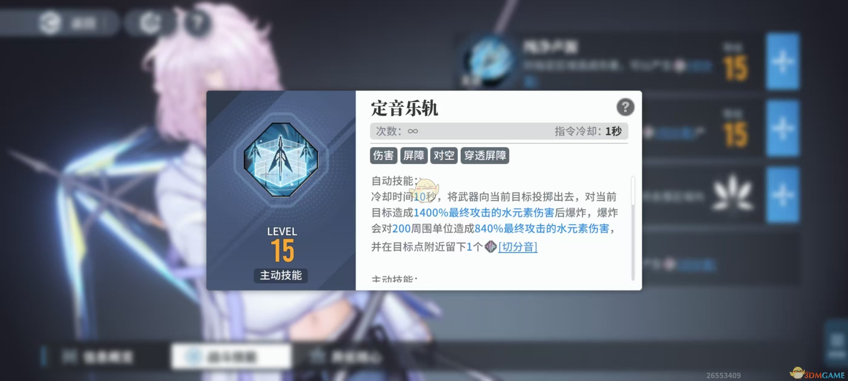 主动技能:定音乐轨:①输出核心手段,需要消耗4个切分音,持续10秒,并生成4面屏障,配合烙痕神迹,屏障破碎时有真伤效果。②定音越轨存在期间,发生传导、汽化、冻结三种反应时,余音会对目标造成一定伤害,并有10秒融甲效果,每隔5秒可以触发一次。理论上,启动时有8个切分音(上限8个)、连续每10秒触发传导、汽化、冻结等反应,余音可以打出极限20秒融甲效果。省出晴雪、北洛等人的位置。