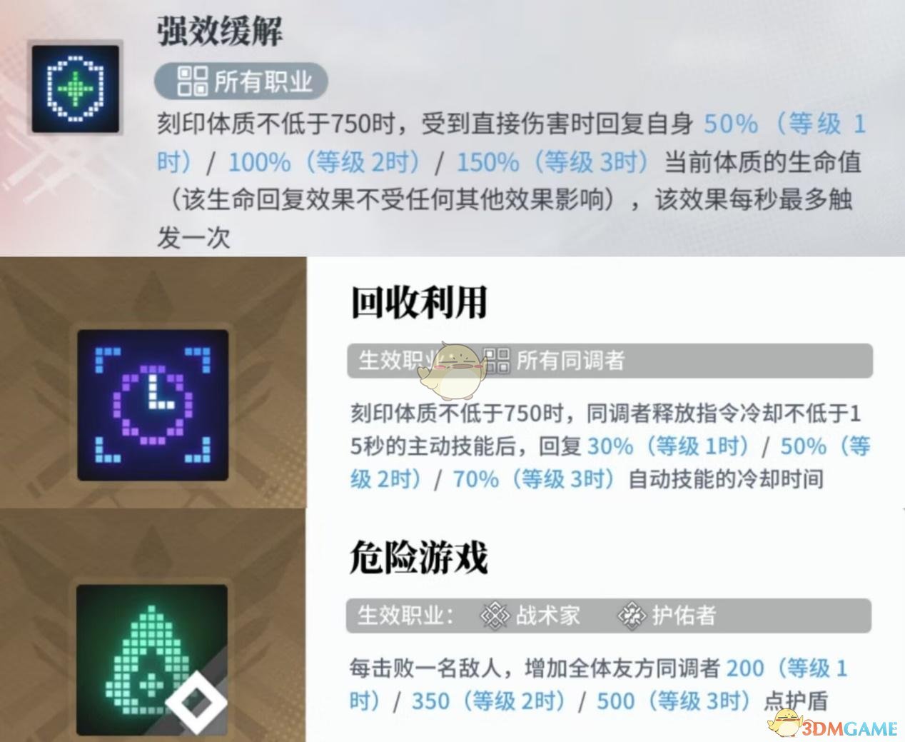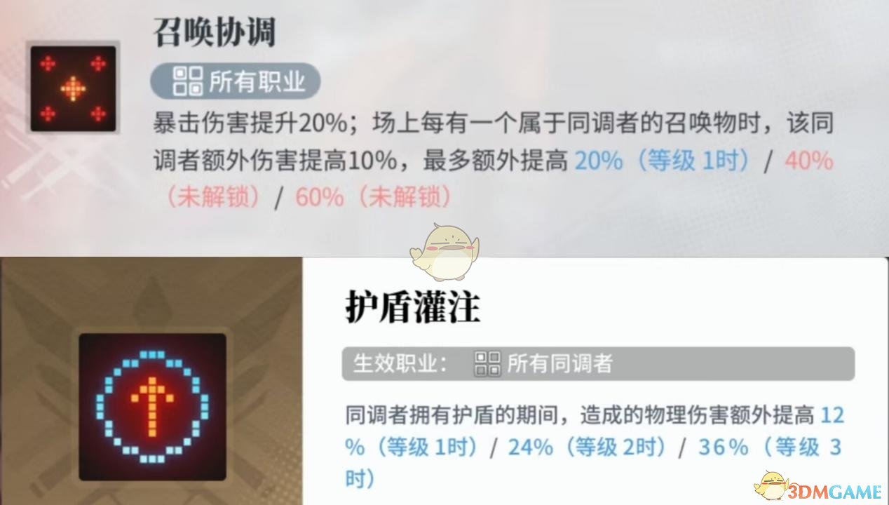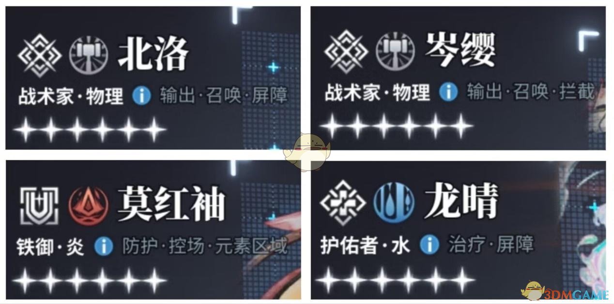 既然这个激励技能对角色属性不做限制,恰恰我们的物理队也不过度在乎对内角色的属性,所以我们就根据【增益/召唤/回复】这3个技能来选择角色,除去北洛本身带有召唤和增益技能,另外三个各自带有的如下: