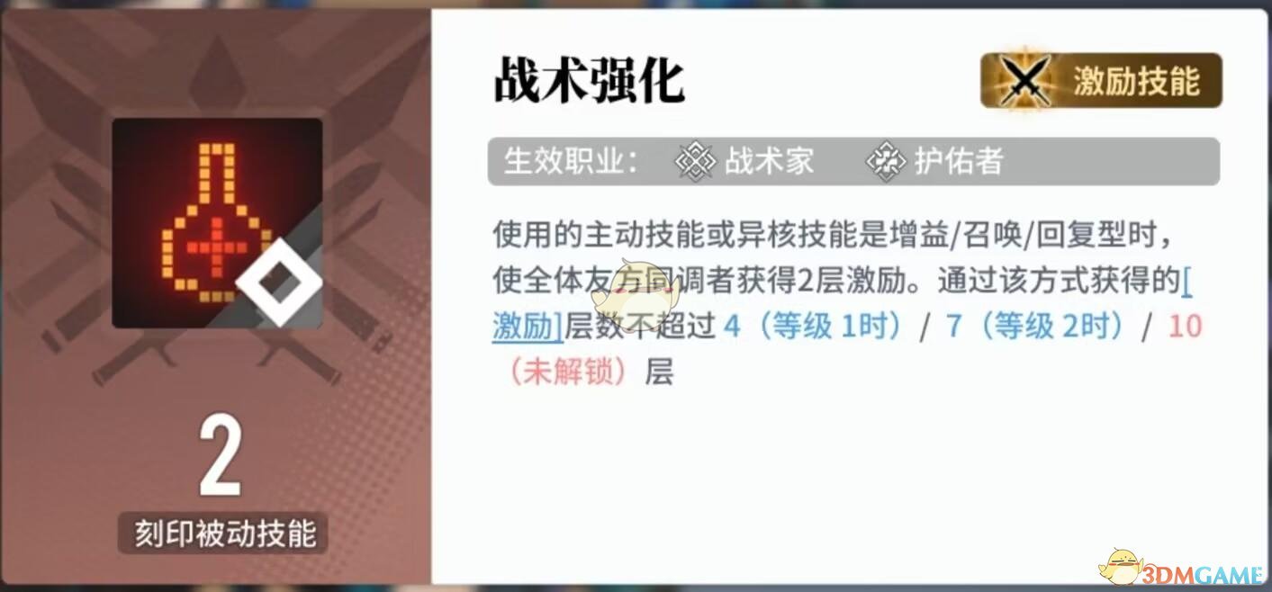 战术强化刻印:最高能获得7层激励效果,并且触发的机制对角色的属性并没有限制,只要是增益/召唤/回复的技能时就能叠加层,最多10层。而最高激励技能的效果在局内最多能叠满20层,每一层百分之20的伤害,也就是一局内能最高获得百分之200的伤害加成。所以这战术强化的刻印能叠满10层已经非常好了。