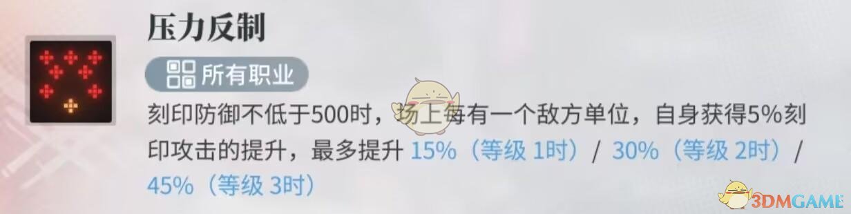这个核心技能“压力反制”能给到队伍属性提升,特别是在pve里面怪不断刷新的时候,其效果能最大化。