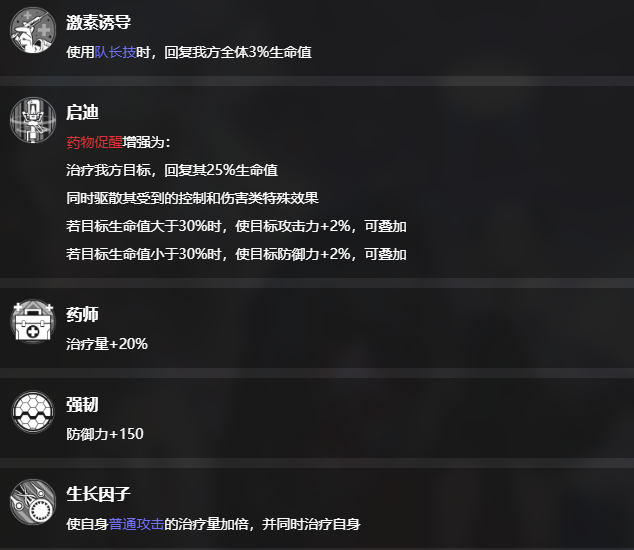 每隔10秒触发1次,被知觉干预标记的目标队友受到攻击时,从牌库或弃牌区将1张药物促醒加入手牌