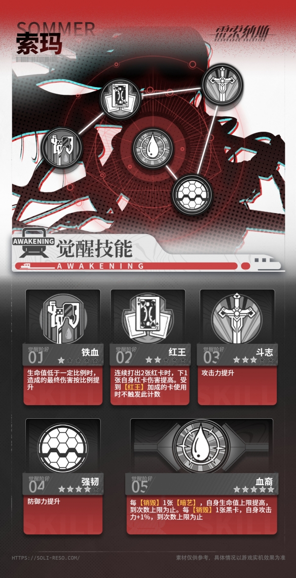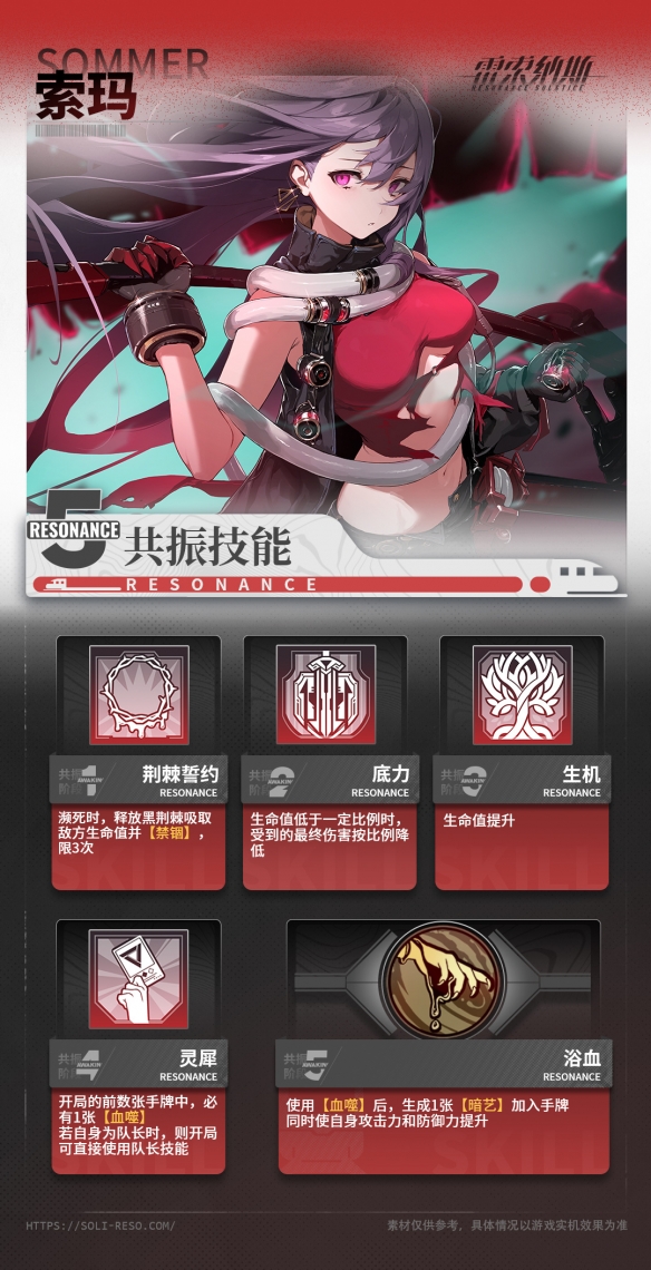 索玛是《雷索纳斯》于2024年6月实装的新SSR角色,那么索玛的技能卡详细效果是什么样的,共振和觉醒又有哪些强化呢?接下来就让我们一起了解一下吧。