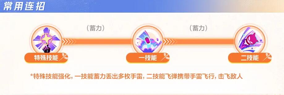 释放特殊技能进行强化然后一技能蓄力扔出手雷,然后二技能飞弹携带手雷飞行击飞敌人。